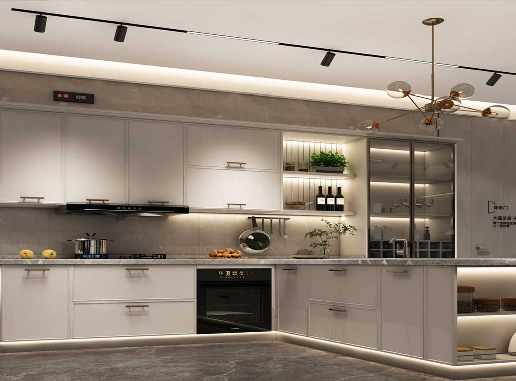 这款舒曼系列,白色欧式经典橱柜是空间独特的标志,温馨的流沙白淳朴中透出欧式的温馨与浪漫。凸起的边式柜门永恒而优雅,透明的玻璃柜门,让实用与展示兼具。
