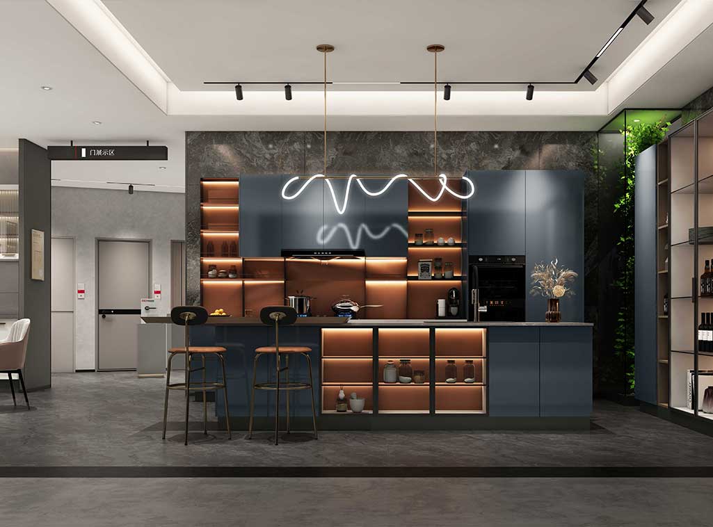 现代简约拉斐系列,采用双饰面板,双一字型设计,打造简约大气的厨房空间,完美分隔洗涤准备区与烹饪操作区,可实现多人配餐,提高厨房操作效率与互动性。金属吊灯点缀空间氛围,于细节处展现力量,呈现中西厨各司其职的区域沉浸感。