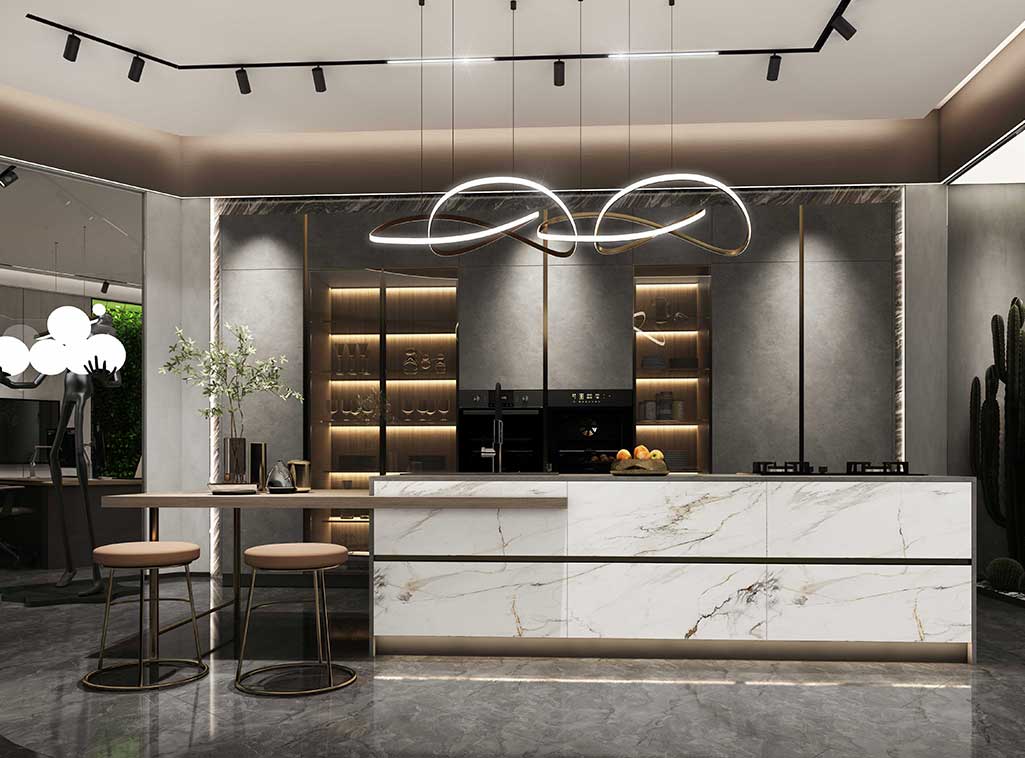 此系列采用智能大岛台设计,内置可移动台面桌,收放自如,当整个台面完全打开,收纳的水龙头自动延伸出台面,供屋主使用 。岛台后方是电器高柜、收纳高柜,还内嵌了单门冰箱,全部采用门板封闭,整洁又利落。酒柜选用高级感十足的灰玻,灯光透过玻璃器皿折射在灰玻上,混合着美酒的微醺,氛围感立即拉满。