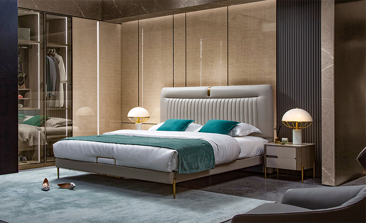 这款床的设计灵感来源于罗马许愿池,许愿池又叫特莱维喷泉,是全球最大的巴洛克式喷泉。传说当情侣一起向许愿池中投入硬币,爱情就会永恒。靠包上的竖线代表着向上喷涌的泉水,是力量的象征。床头的金属扣件则是象征爱情的钱币正在被投入水中,寓意夫妻爱情美满长久,事事顺遂,心想事成;