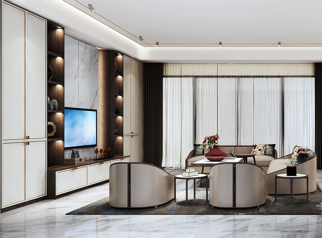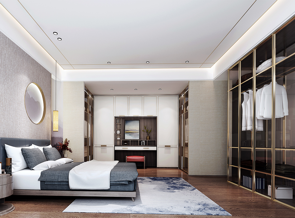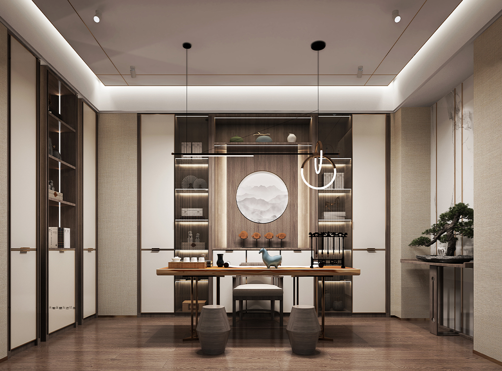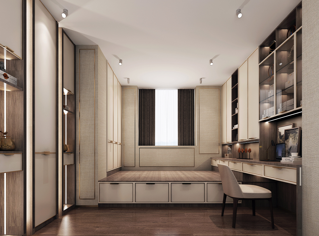 该系列产品将新中式轻奢风的魅力与金属结合,门型采用内嵌金属条与极简吸塑造型,利落的线条与极简轻奢的气质完美融合,给家里加入一种独特的轻奢格调。书房L型布局,书柜和装饰柜统一的色调处理,黄铜拉丝铝框玻璃门与内嵌软灯带结合,营造出静谧的书房环境,亦可作为茶室使用。